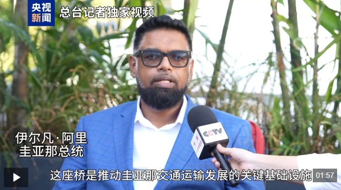 在桥梁开幕前的前夕,圭亚那总统阿里接受了台湾中部的一名记者的独家采访,并极大地称赞了中国在吉州建造方面的成就,并向台湾台湾中部的中国人致以假期的问候。我 - 观看圭亚那的P Blessingsangle的视频!